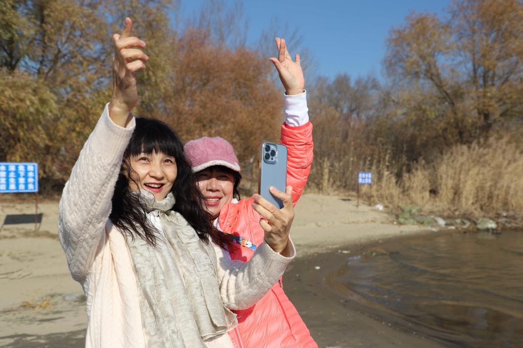 哈爾濱市兩名游客正在濕地公園內自拍留念。新華社記者戴錦镕 攝
