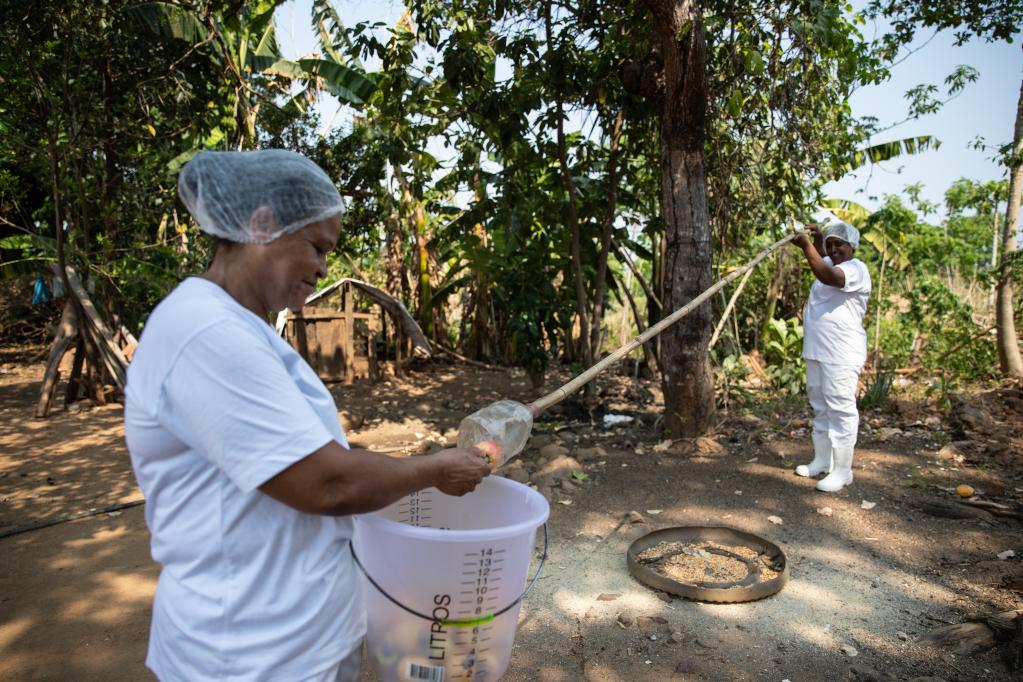 2022年10月4日,在巴西托坎廷斯州馬利亞迪尼亞,食品工程學(xué)家格拉謝拉·帕盧多(右)和工人一起工作。新華社記者 王天聰 攝