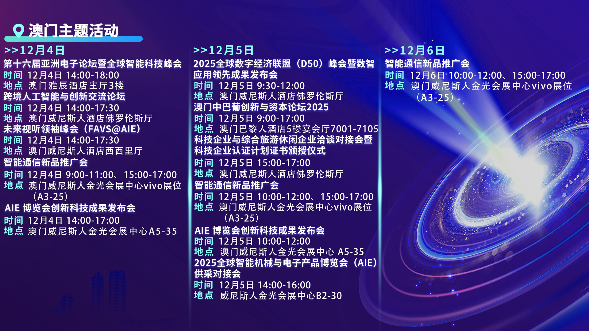 "12月4日至6日,2025全球智能機械與電子產(chǎn)品博覽會(huì )(AIE)以“一展雙城”模式在澳門(mén)與珠海同步舉辦。"