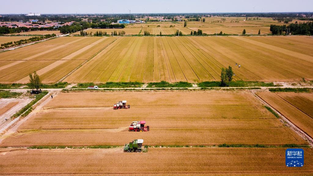 2022年6月7日,在山東省惠民縣桑落墅鎮,農民駕駛農機收獲小麥(無(wú)人機照片)。新華社記者 郭緒雷 攝