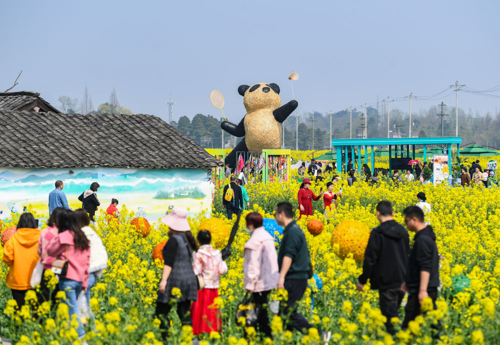 3月5日,在四川省崇州市道明鎮,游客在油菜花田中觀(guān)光。新華社記者 王曦 攝