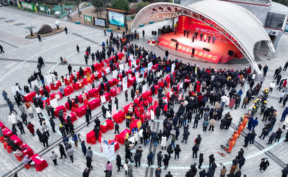 2月4日拍攝的浙江省義烏市蘇溪鎮“百企千崗”新春首場(chǎng)招聘會(huì )現場(chǎng)(無(wú)人機照片)。新華社記者 徐昱 攝