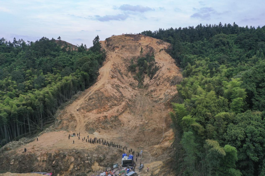 車(chē)行至縉云山腳,由于道路狹窄,汽車(chē)已不能通行,只能步行或是搭乘摩托車(chē)前往。因為是新開(kāi)挖的道路,加上天氣干燥,運送物資的摩托車(chē)來(lái)回奔跑,將近2公里的道路幾乎全時(shí)段都是處于漫天塵土飛揚的狀態(tài)。摩托轟鳴,救援人員腳步匆忙,抬頭望去,山上是密密麻麻排成一溜的志愿者組成的“人鏈”,一場(chǎng)“大戰”來(lái)臨前的緊迫感壓上心頭。