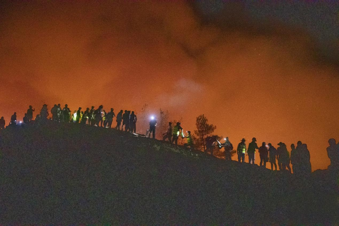 8月25日晚,在山頂隔離帶,救援人員和志愿者嚴陣以待。
