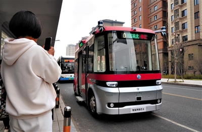 智能網(wǎng)聯(lián)巴士901線(xiàn)測試車(chē)在河北雄安新區容東片區道路上???。新華社記者 牟宇 攝