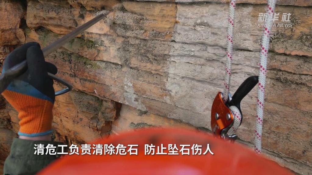 在山西省黎城縣黃崖洞文化旅游區,有一對被稱(chēng)為“崖壁清危工”的師徒檔,每年“五一”等節假日來(lái)臨前,他們都要對山體進(jìn)行檢查、清理,在數百米高的懸崖峭壁間“行走”,揮動(dòng)手中的鋼釬,排除風(fēng)化松動(dòng)的危石,防止墜石傷人,守護景區游客的安全。