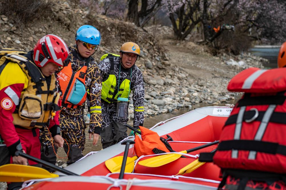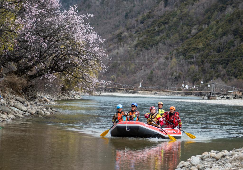 扎史品初(右二)和隊友在巴河上漂流(4月13日攝)。新華社記者 孫非 攝