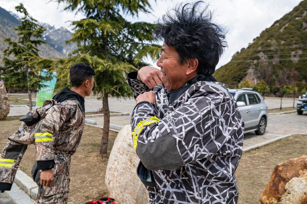 扎史品初(右)正在更換漂流用的連體服(4月14日攝)。新華社記者 孫非 攝