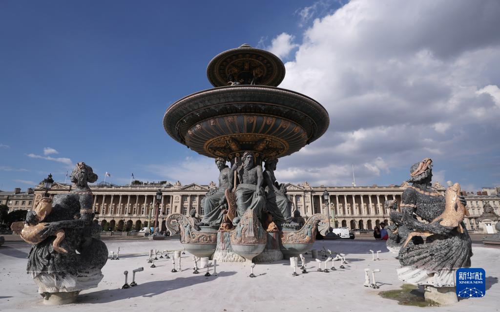 這是8月17日在法國巴黎協(xié)和廣場(chǎng)拍攝的暫停噴水的河神噴泉。