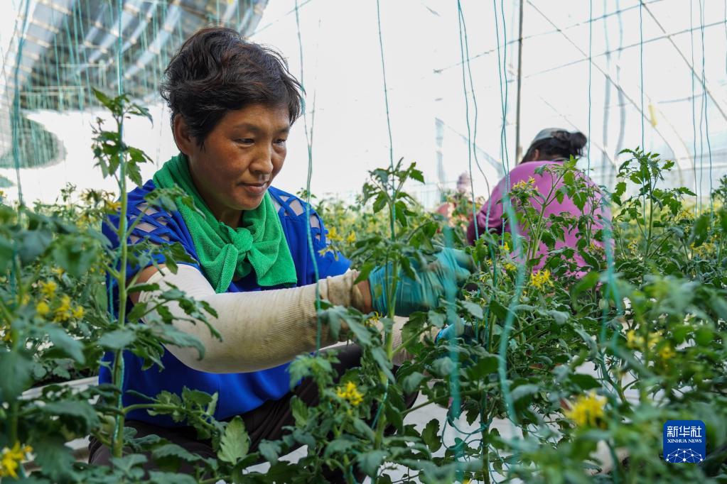 8月17日,園區工人在為西紅柿修枝。