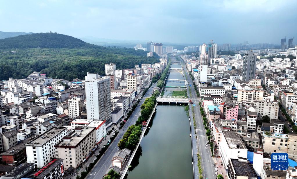 洛南縣的縣河穿城而過(guò),治理后的河道流淌著(zhù)清澈的河水(8月18日攝,無(wú)人機照片)。