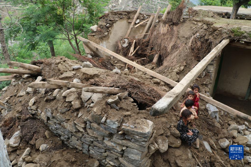 8月18日,孩子們坐在阿富汗努里斯坦省被洪水損毀的房屋廢墟上。