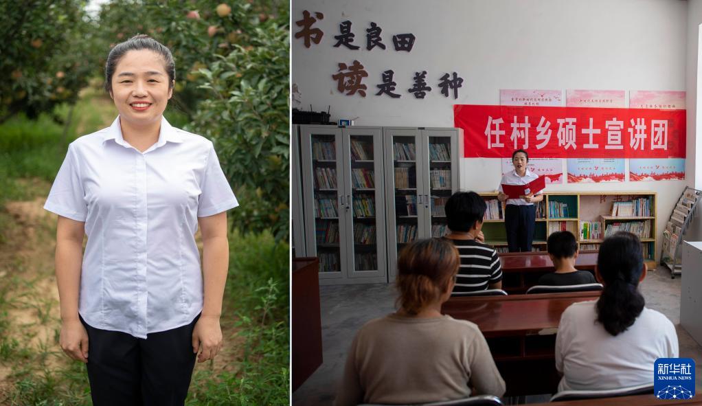 拼版照片:左圖為任村鄉碩士宣講團成員李昕瑜;右圖為李昕瑜在任村鄉東賈村進(jìn)行宣講(8月19日攝)。