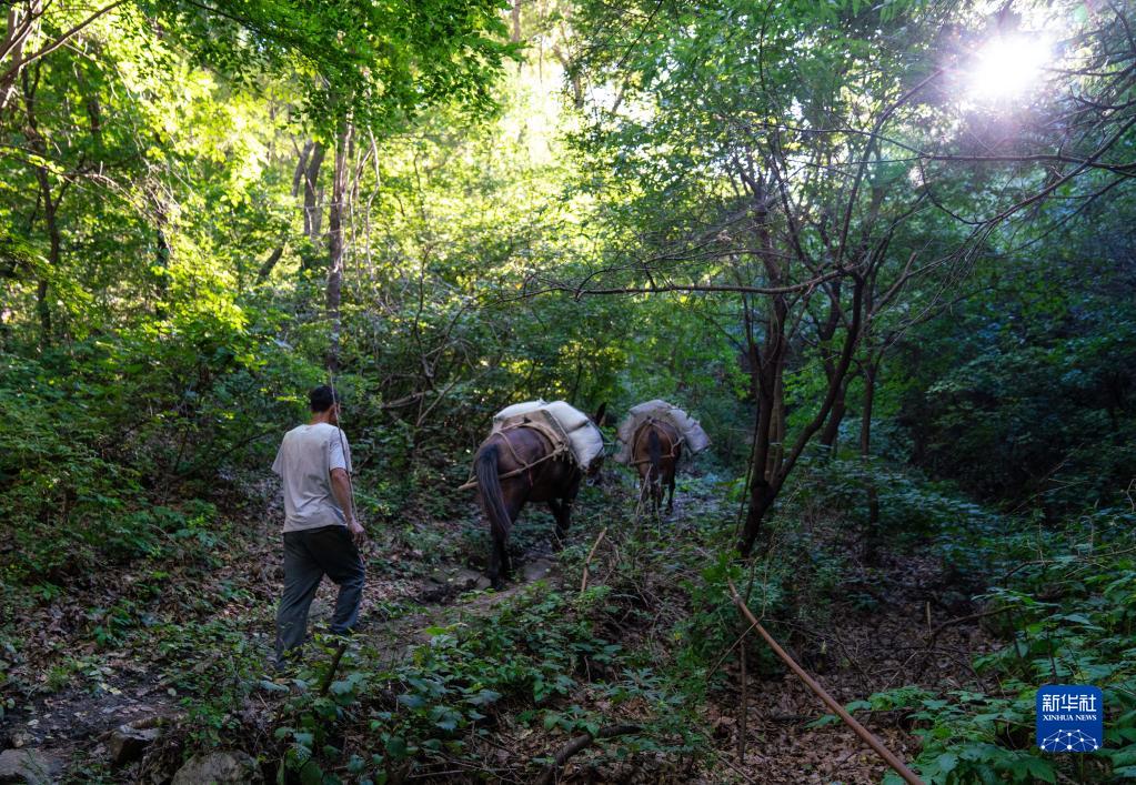 受環(huán)境所限,工人利用牲畜馱料上山(8月16日攝)。