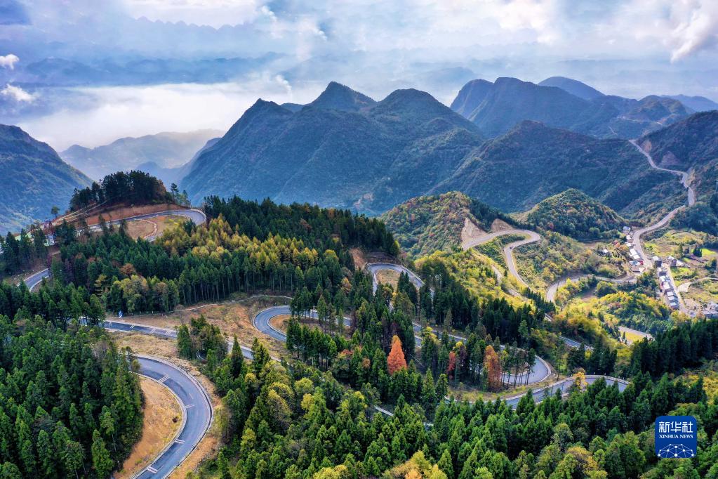 這是10月31日在湖北省恩施土家族苗族自治州建始縣業(yè)州鎮拍攝的秋景(無(wú)人機照片)。 新華社發(fā)(張遠明 攝)