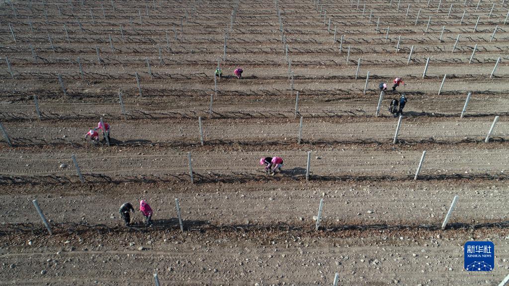 在位于寧夏銀川市賀蘭山東麓的藍賽酒莊,農民進(jìn)行埋藤作業(yè)(11月5日攝,無(wú)人機照片)。