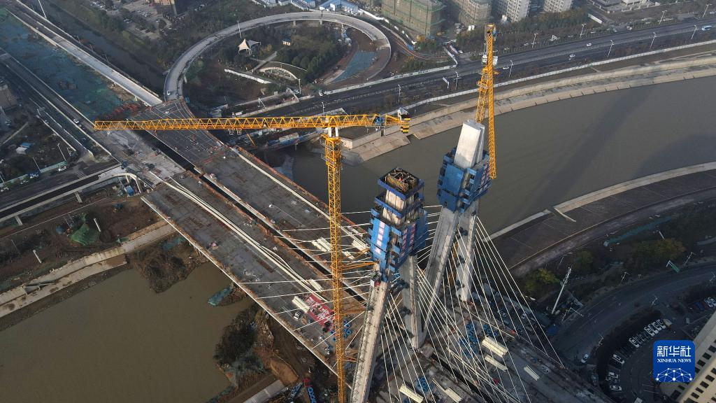 這是正在進(jìn)行主塔封頂施工的引江濟淮金寨南路橋(11月24日攝,無(wú)人機照片)。