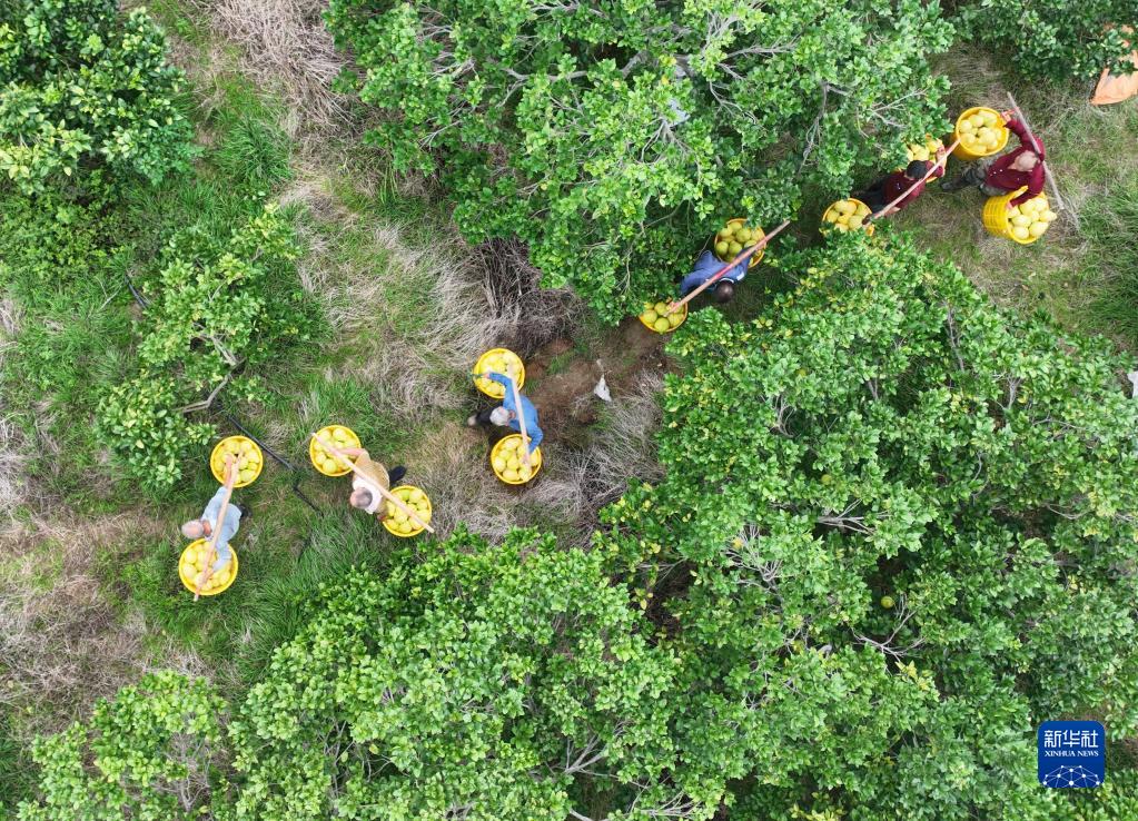 11月28日,在永州市道縣梅花鎮赤源村柚子種植基地,村民在挑運柚子(無(wú)人機照片)。