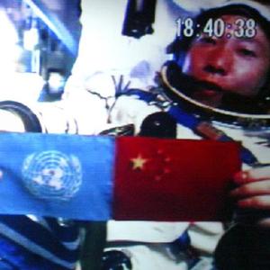 2003年10月15日18時(shí)40分,中國第一位航天員楊利偉從太空向世界各國人民問(wèn)好,并在艙內并列展示了五星紅旗和聯(lián)合國旗(攝于北京航天指揮控制中心大屏幕)。新華社發(fā)