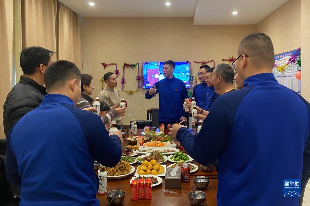 1月21日,在黑龍江漠河北極村消防救援站內,來(lái)自湖北武漢的游客與消防員一起吃年夜飯。北極村消防救援站的消防員在執勤過(guò)程中,通過(guò)與這些游客交流得知他們要在北極村過(guò)年,便邀請他們來(lái)北極村消防站一起迎接兔年春節。