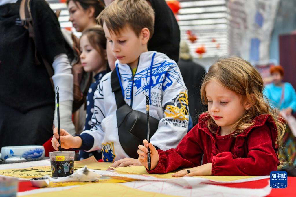 1月21日,兒童在俄羅斯莫斯科的迎新春活動(dòng)上學(xué)習書(shū)法。