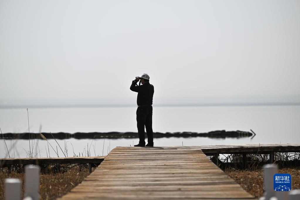 4月19日,胡登雨在岱海自然保護區巡護查看。