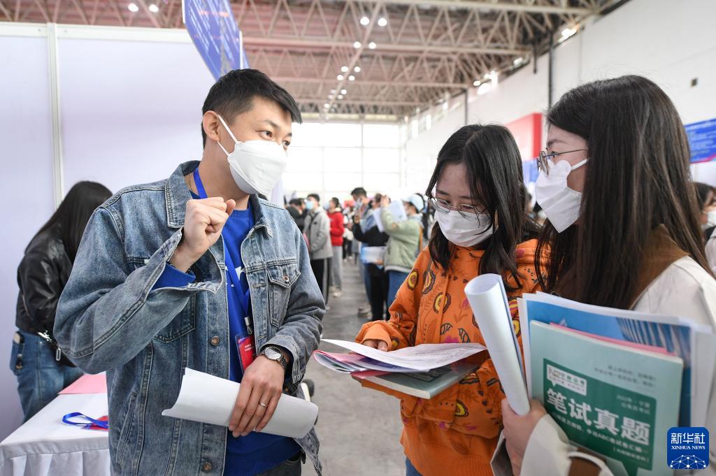 4月21日,求職者(右)在招聘會(huì )現場(chǎng)與用人單位工作人員交流。