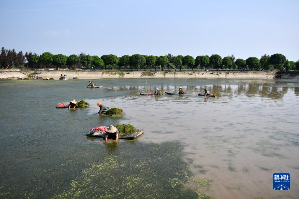 4月20日,工人在大通湖水生植物產(chǎn)業(yè)示范園內采收水草。