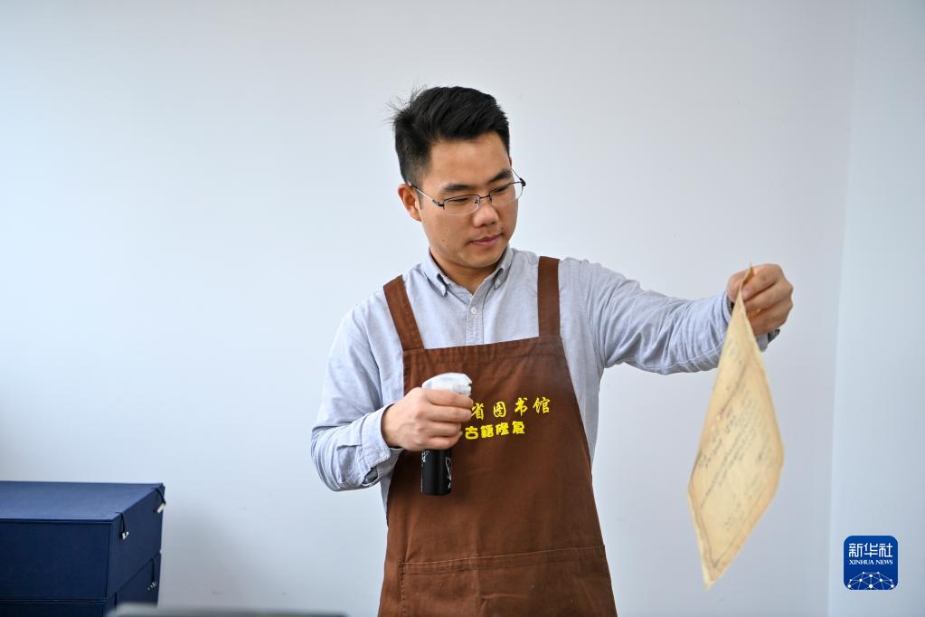 在山西省圖書(shū)館古籍修復中心,程文濤為古籍噴水準備修復(4月21日攝)。