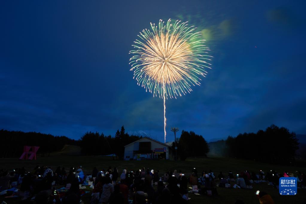 4月22日,人們在日本山梨縣富士山腳下欣賞煙花。