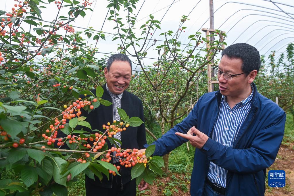 4月23日,在杭州市臨安區錦南街道上甘村的櫻桃大棚內,種植戶(hù)陳元昌(左)聽(tīng)農技專(zhuān)家現場(chǎng)指導櫻桃種植。