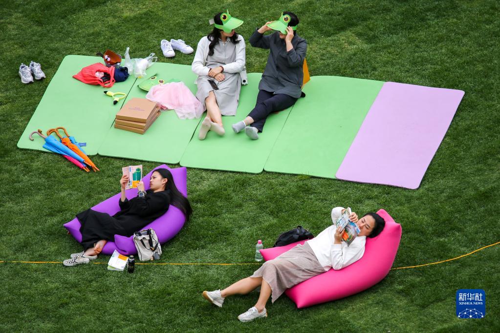 4月23日,人們在韓國首爾廣場(chǎng)上閱讀和休息。