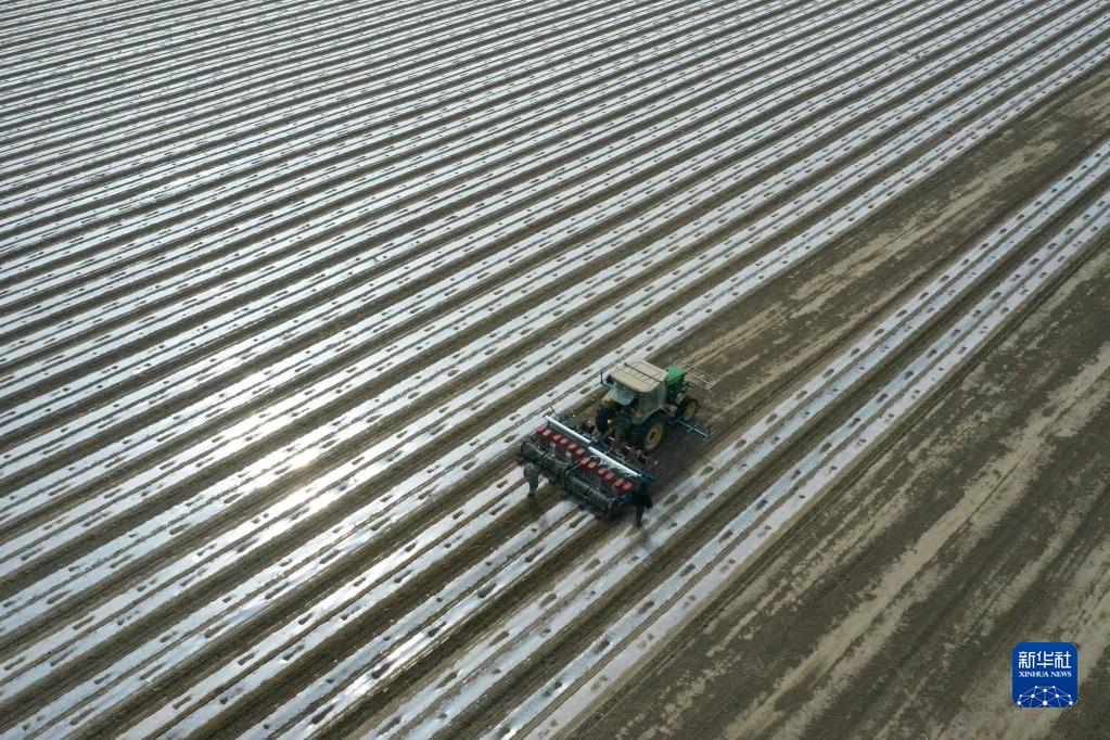 新疆麥蓋提縣,搭載北斗導航自動(dòng)駕駛系統的精量播種機在棉田春播(4月1日攝,無(wú)人機照片)。