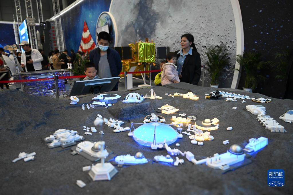 4月24日,觀(guān)眾在科普展區參觀(guān)“未來(lái)月球科研站”設想模型。