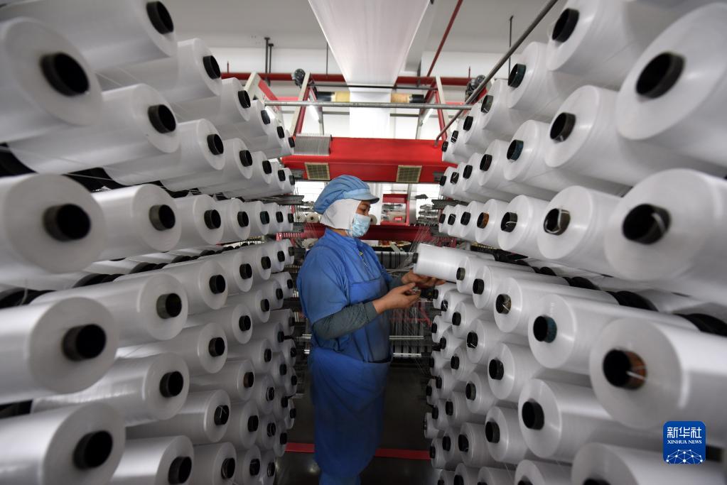 4月25日,在山東省臨沂市臨沭縣一塑編企業(yè)車(chē)間,工人加工塑編產(chǎn)品。