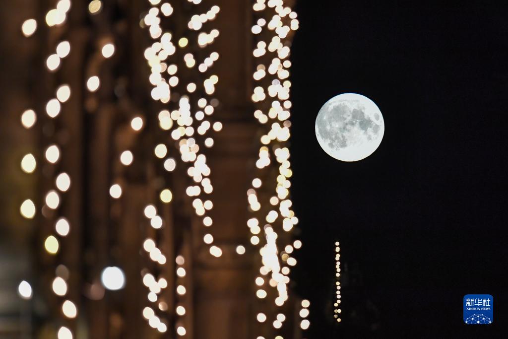 這是8月30日在俄羅斯首都莫斯科的古姆商場(chǎng)旁拍攝的“超級月亮”。