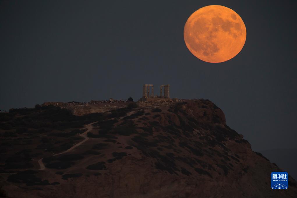 8月30日,“超級月亮”從希臘蘇尼翁角的波塞冬廟上空升起。