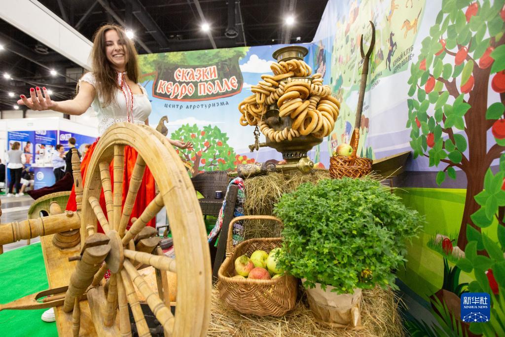 8月31日,一名工作人員在俄羅斯圣彼得堡第32屆國際農業(yè)工業(yè)展上推介產(chǎn)品。