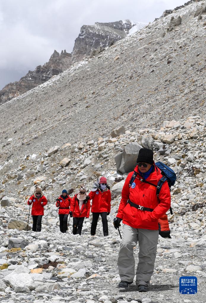 中國科學(xué)院院士、北京大學(xué)環(huán)境科學(xué)與工程學(xué)院院長(cháng)朱彤(右一)和科研人員在珠峰登山大本營(yíng)和絨布冰川間徒步穿梭(5月1日攝)。新華社記者 姜帆 攝
