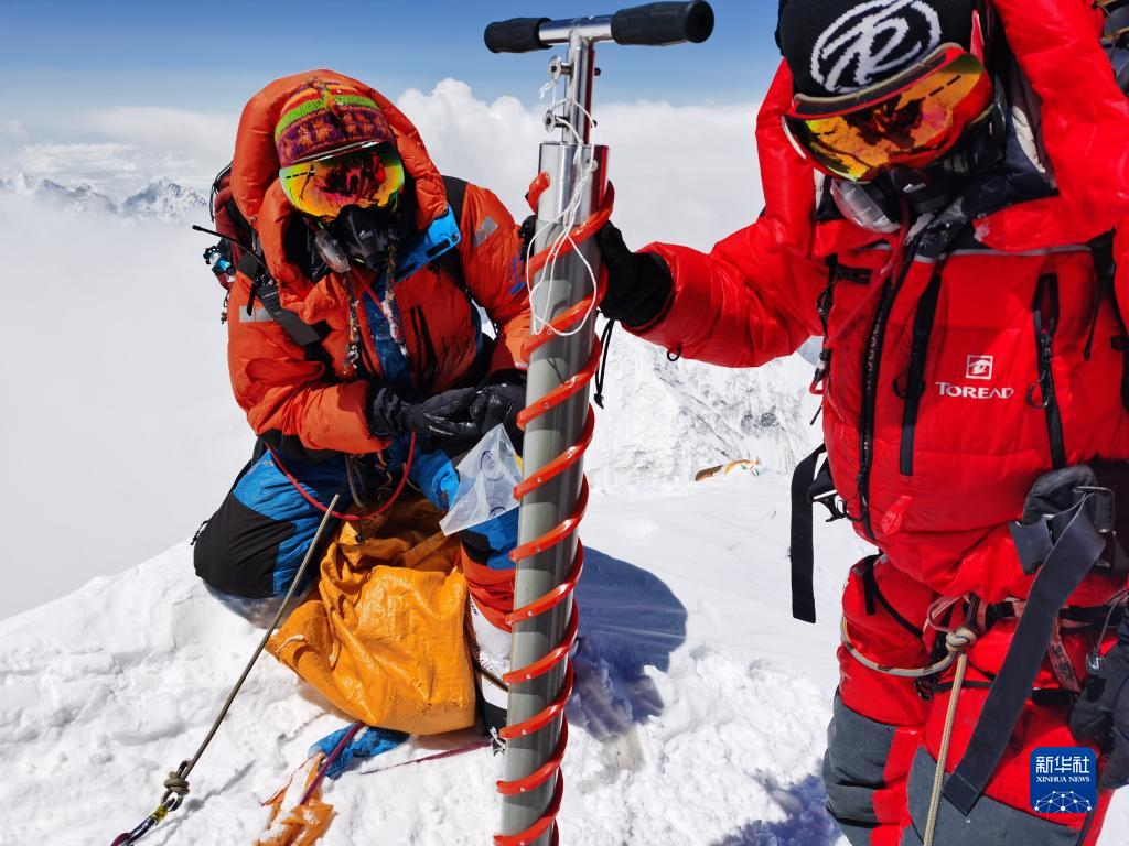 在珠穆朗瑪峰峰頂,科考隊員在采集冰雪樣品(5月4日攝)。新華社特約記者 索朗多吉 攝
