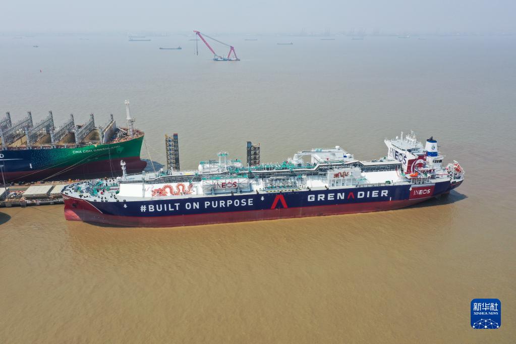 5月16日拍攝的中國船舶集團旗下江南造船建造的99000立方米B型艙超大型乙烷運輸船H2625船(無(wú)人機照片)。新華社記者 丁汀 攝