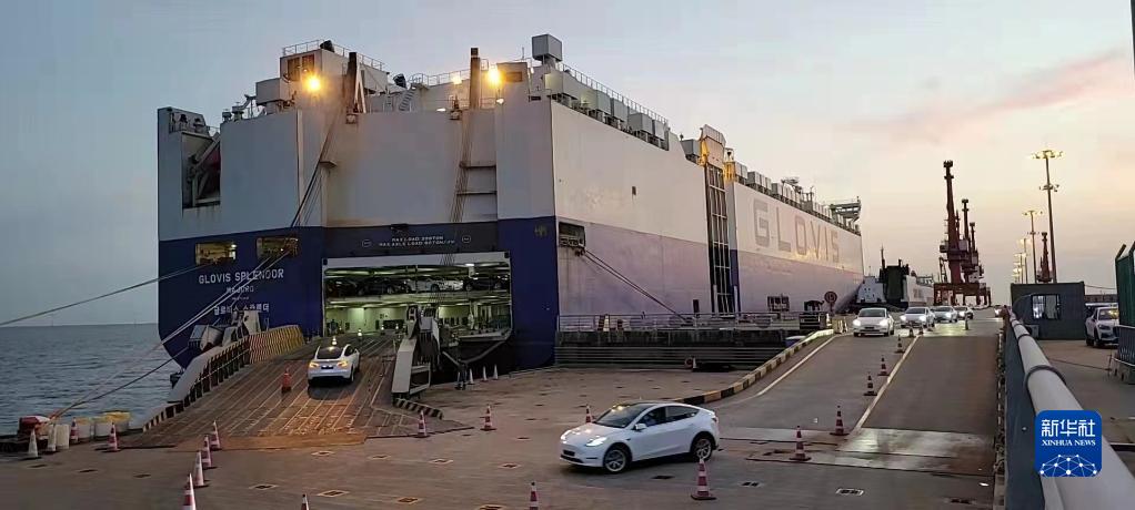 5月11日在上海南港碼頭拍攝的特斯拉電動(dòng)汽車(chē)裝船現場(chǎng)。這是特斯拉上海超級工廠(chǎng)復工復產(chǎn)后首批次整船出口。新華社發(fā)