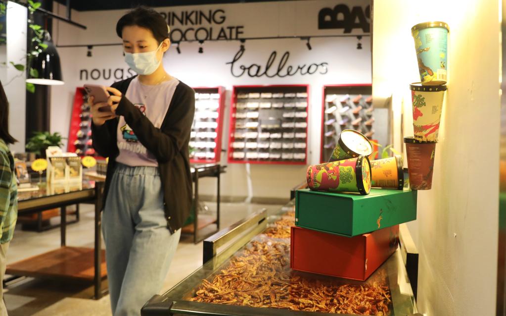 游客走在位于上海楊浦濱江的奧地利珍得巧克力劇院商店內(2022年9月24日攝)。在即將開(kāi)幕的第五屆進(jìn)博會(huì )上,珍得巧克力除了擴大展位面積外,也將為中國市場(chǎng)帶來(lái)更多全新口味的巧克力。新華社記者 方喆 攝