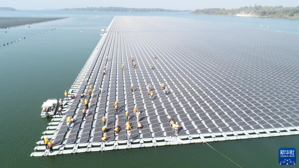 2021年1月23日,施工人員檢查中泰兩國聯(lián)合承建的泰國烏汶府詩(shī)琳通大壩綜合浮體光伏項目的太陽(yáng)能板安裝情況。新華社發(fā)(泰國國家電力局項目組供圖)