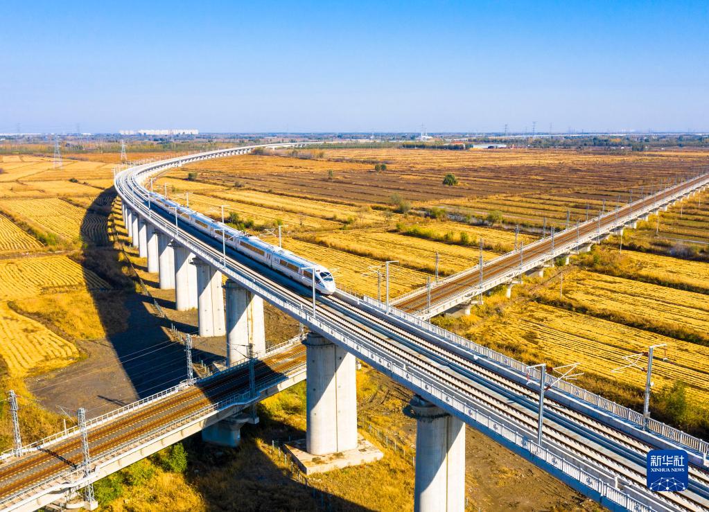 這是在天津北辰區拍攝的動(dòng)車(chē)組列車(chē)行駛在京濱城際鐵路寶坻至北辰段(2022年11月4日攝,無(wú)人機照片)。新華社發(fā)(李佳駿 攝)