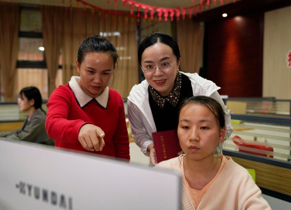 在廣西欽州市靈山縣靈城街道白水村,甘有琴(左一)向全國人大代表黃超(左二)介紹自家電商銷(xiāo)售客服的運營(yíng)情況(資料圖)。新華社記者 楊馳 攝