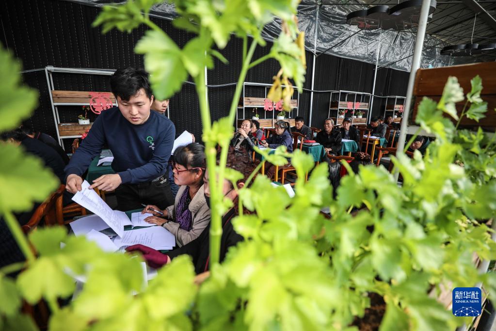 在遼寧省盤(pán)錦市大洼區田家街道大堡子村,回鄉創(chuàng )業(yè)大學(xué)生郭佳明(前左)在培訓課上回答農民提出的問(wèn)題(2019年4月15日攝)。新華社記者 潘昱龍 攝
