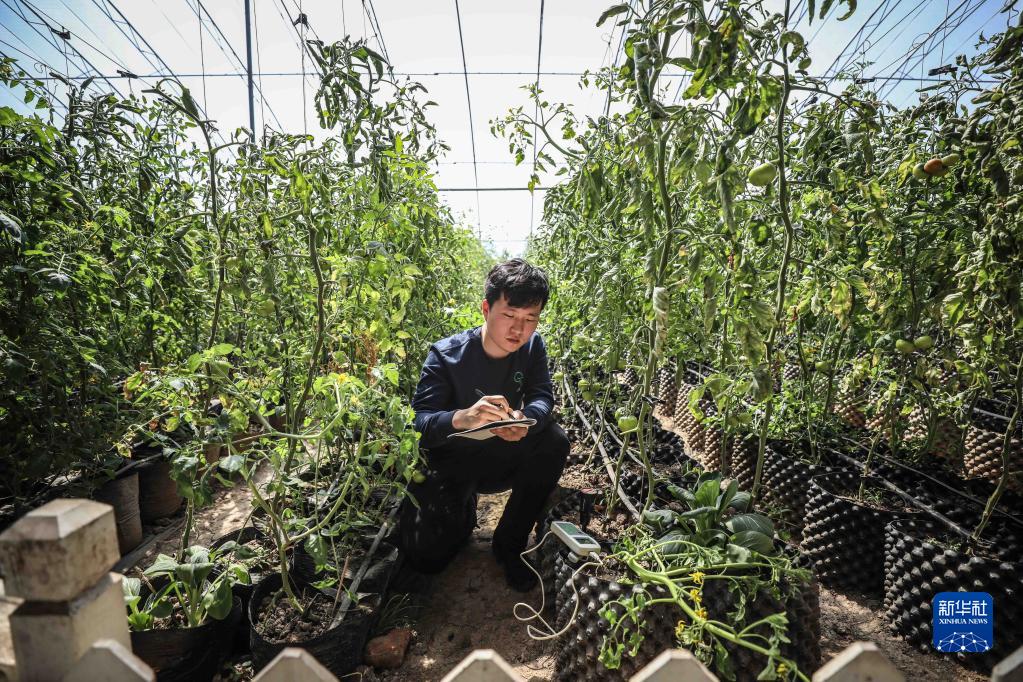 在遼寧省盤(pán)錦市大洼區田家街道大堡子村,回鄉創(chuàng )業(yè)大學(xué)生郭佳明在溫室大棚內查看堿地西紅柿的生長(cháng)情況(2019年4月15日攝)。新華社記者 潘昱龍 攝