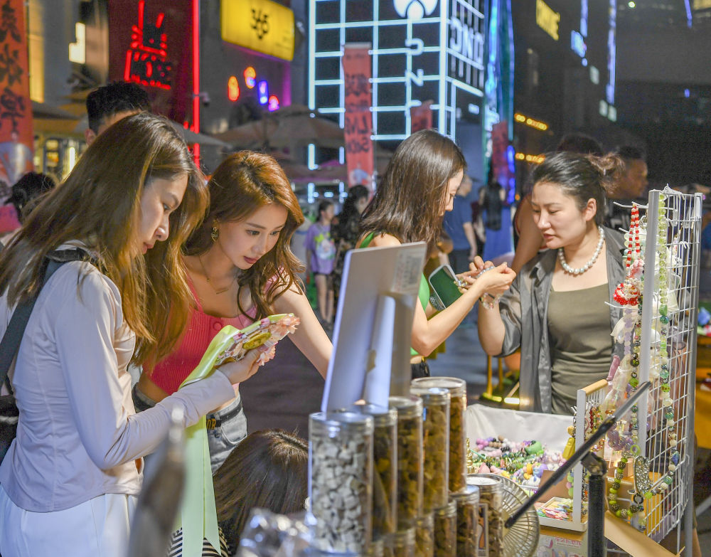 消費者在位于重慶市江北區鎏嘉碼頭的小熊集市選購飾品(2023年8月4日攝)。新華社記者 王全超 攝