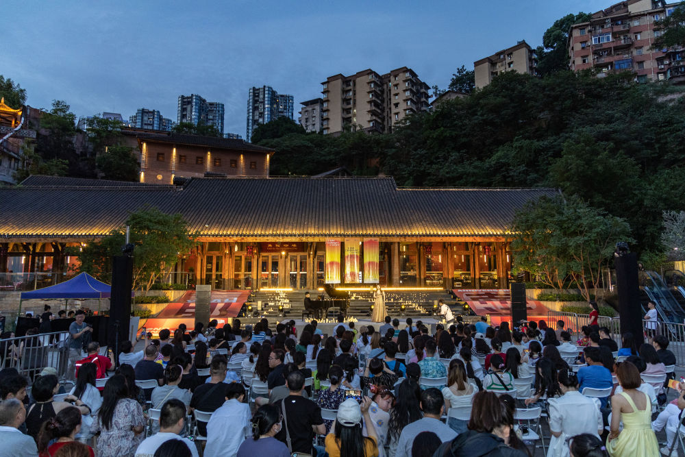2023年6月10日,在重慶故宮文物南遷紀念館外廣場(chǎng),人們在欣賞重慶故宮文物南遷紀念館2周年“燭光音樂(lè )會(huì )”。新華社記者 黃偉 攝